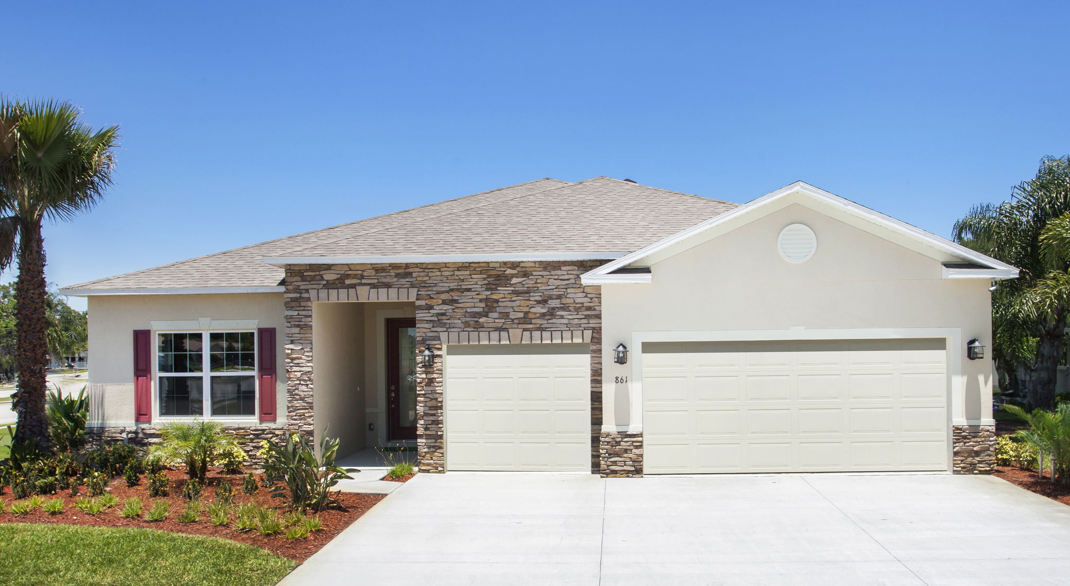 Stylish single-story suburban home with stone accents, white garage doors, and a manicured front lawn under a clear blue sky.