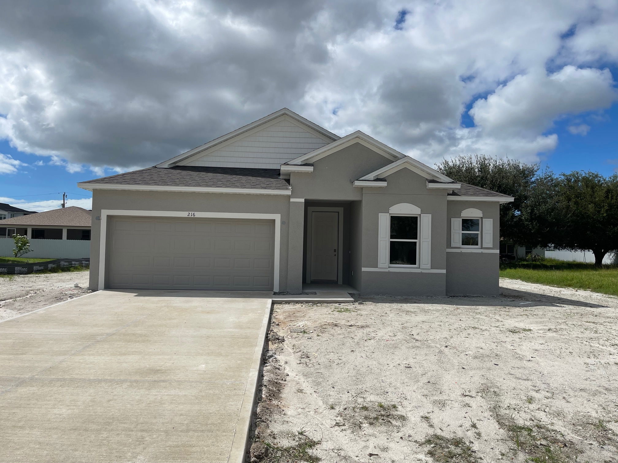 Modern single-story house with a two-car garage and landscaped front yard under a blue sky.