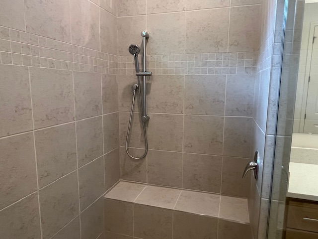 Modern bathroom with spacious glass shower, wooden cabinetry, and tile flooring.