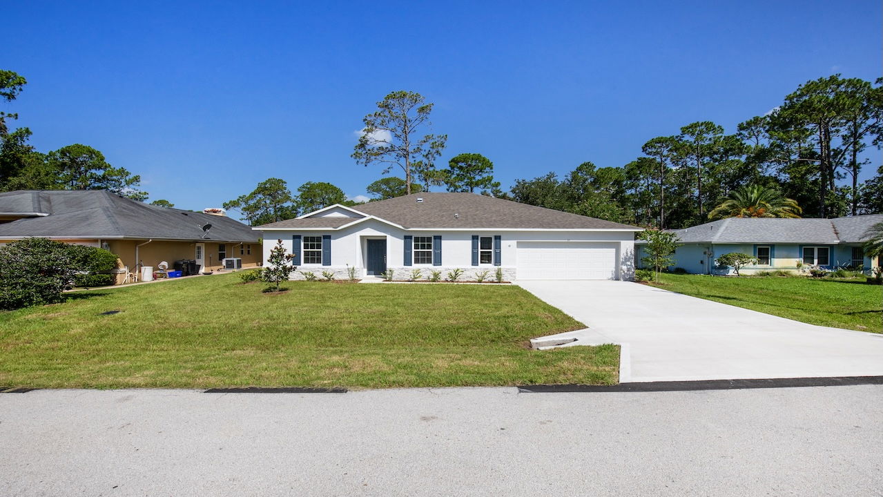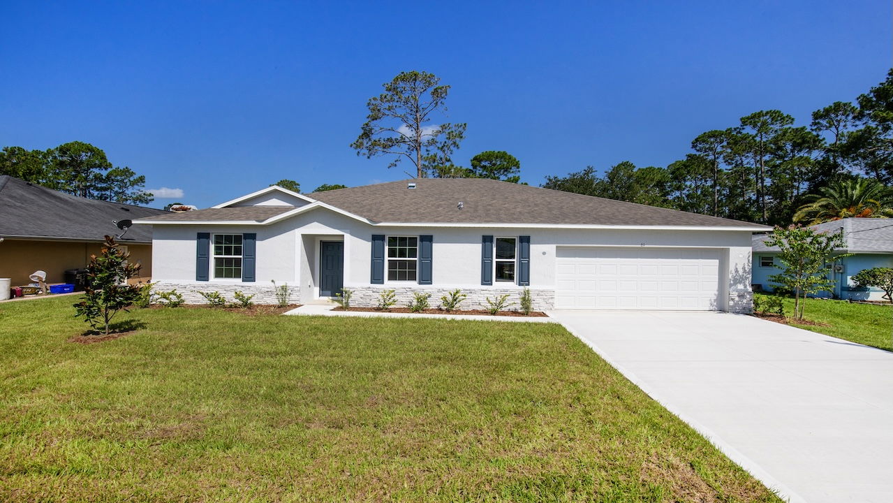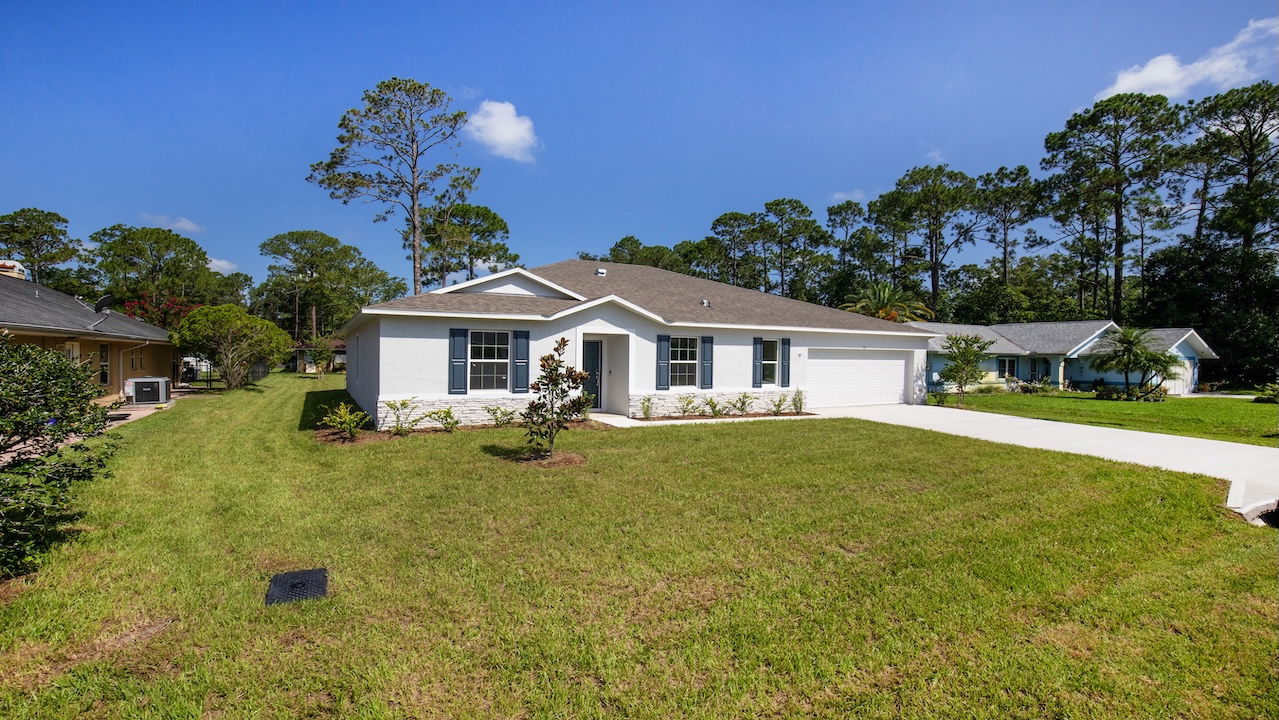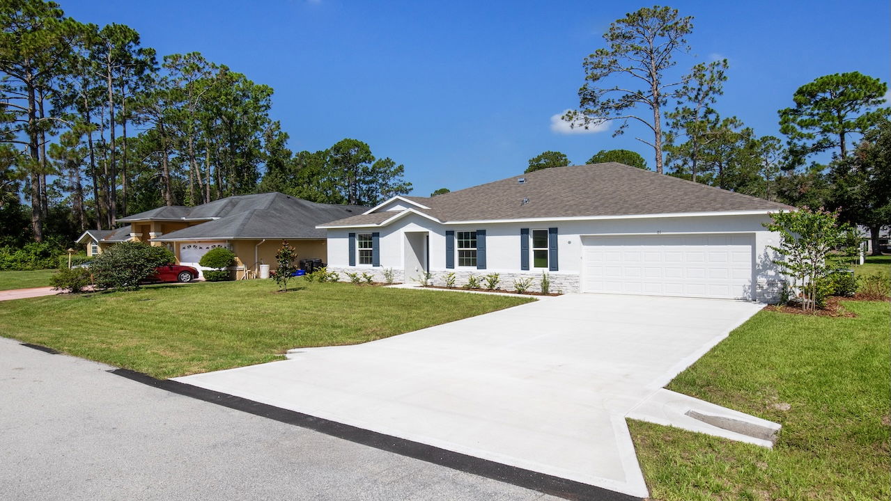 Single-story suburban house with a well-maintained lawn and attached garage under a blue sky.