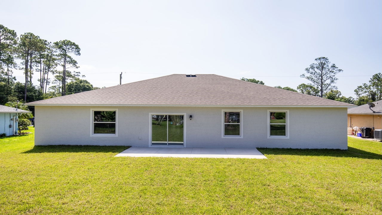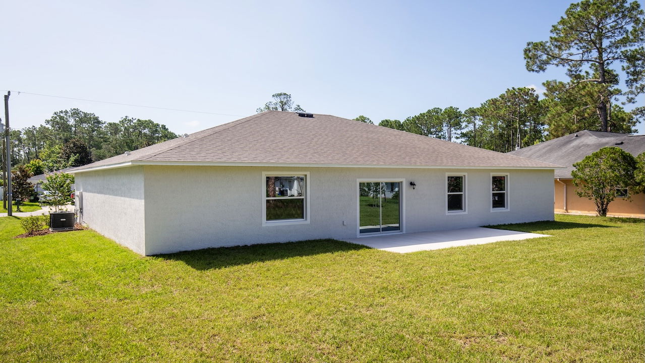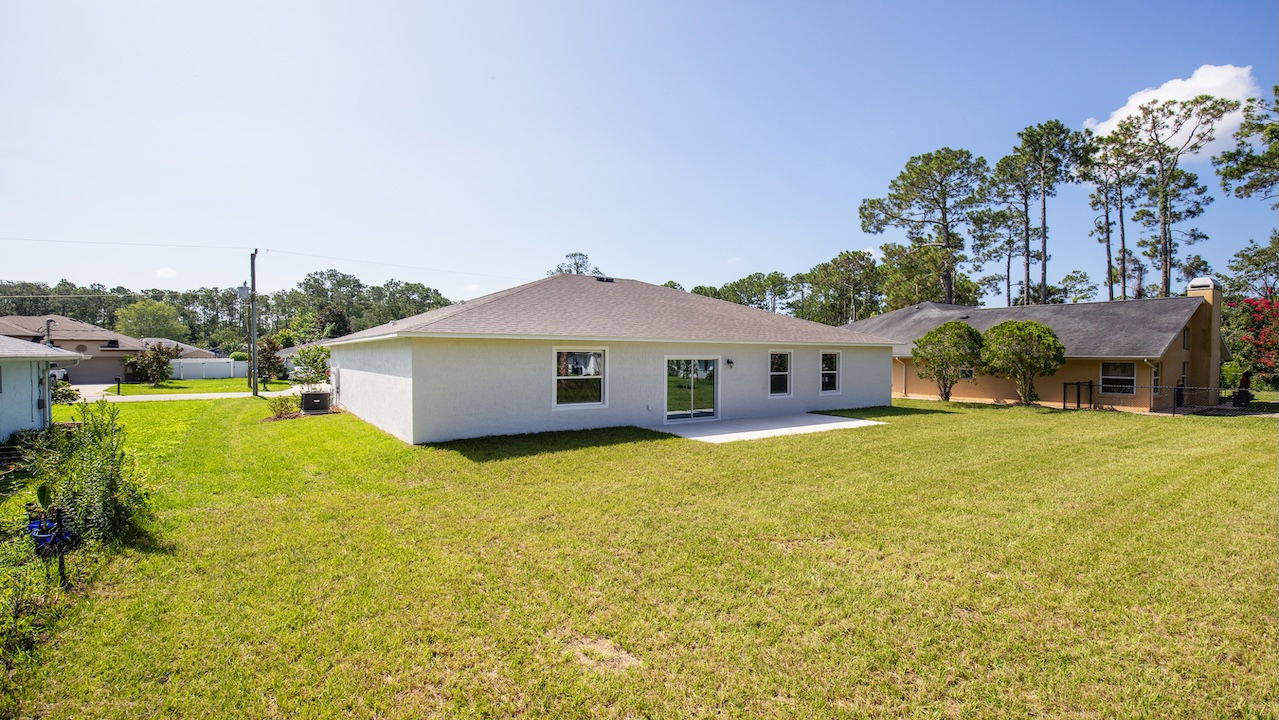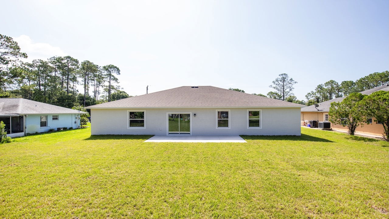 Single-story suburban house with a well-maintained lawn and attached garage under a blue sky.