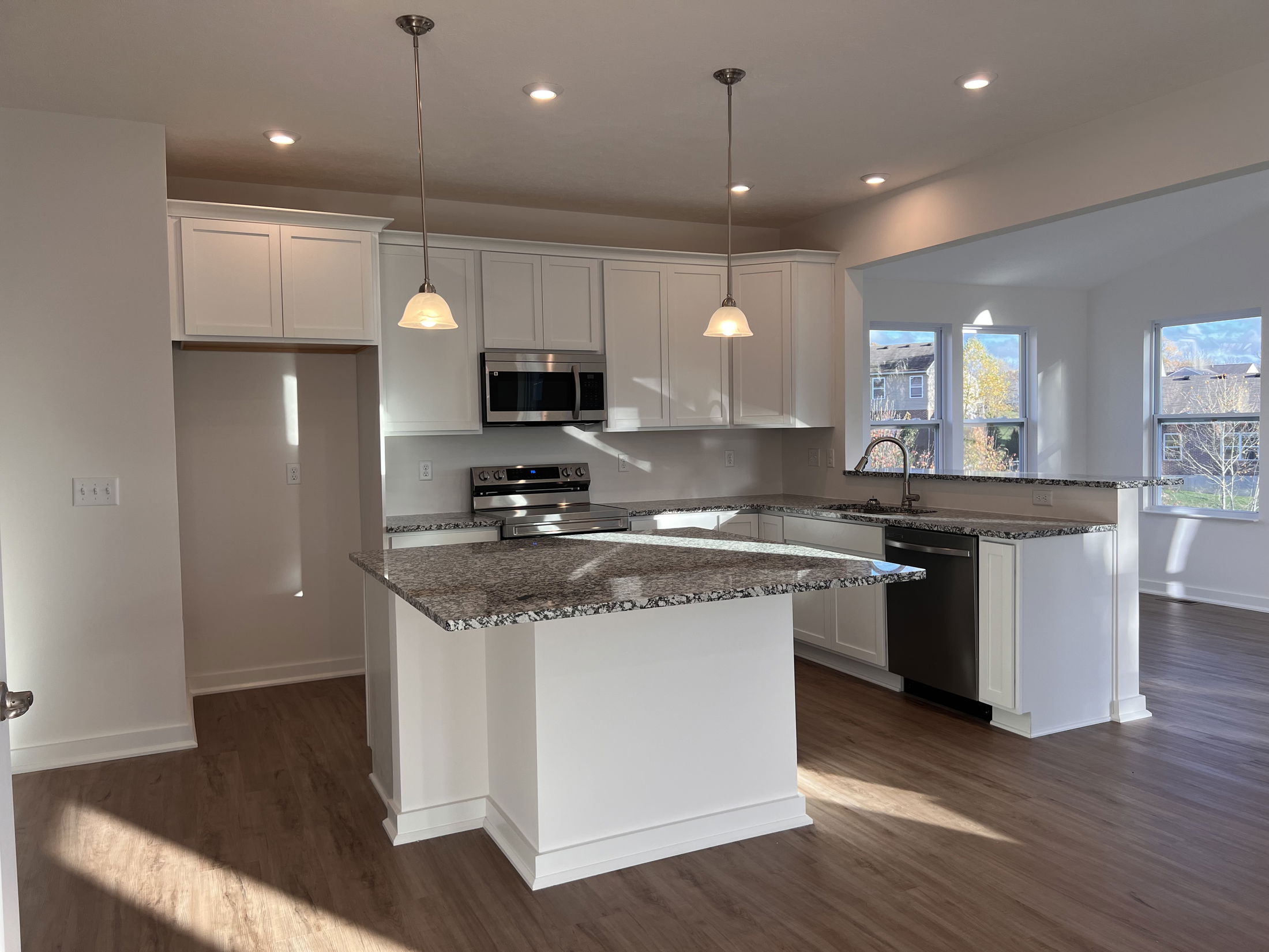 Bright, modern kitchen with granite countertops, stainless steel appliances, and large windows overlooking a suburban neighborhood.
