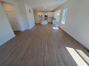 Bright, empty living room with hardwood floors, two windows, and a view of the granite kitchen counter in a modern home.