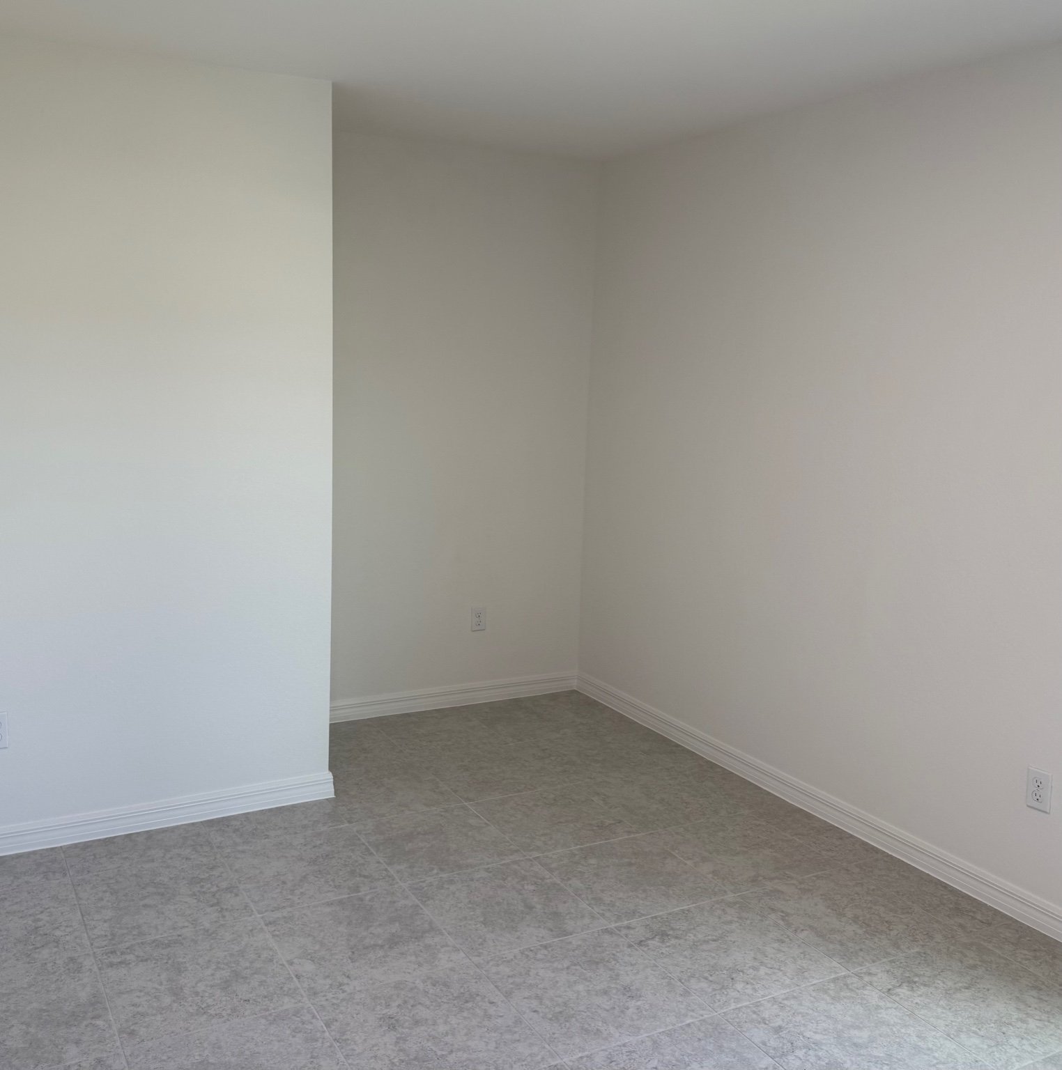 An empty, newly renovated room with tiled flooring, featuring an open door to a closet and another to a bathroom with a white vanity.