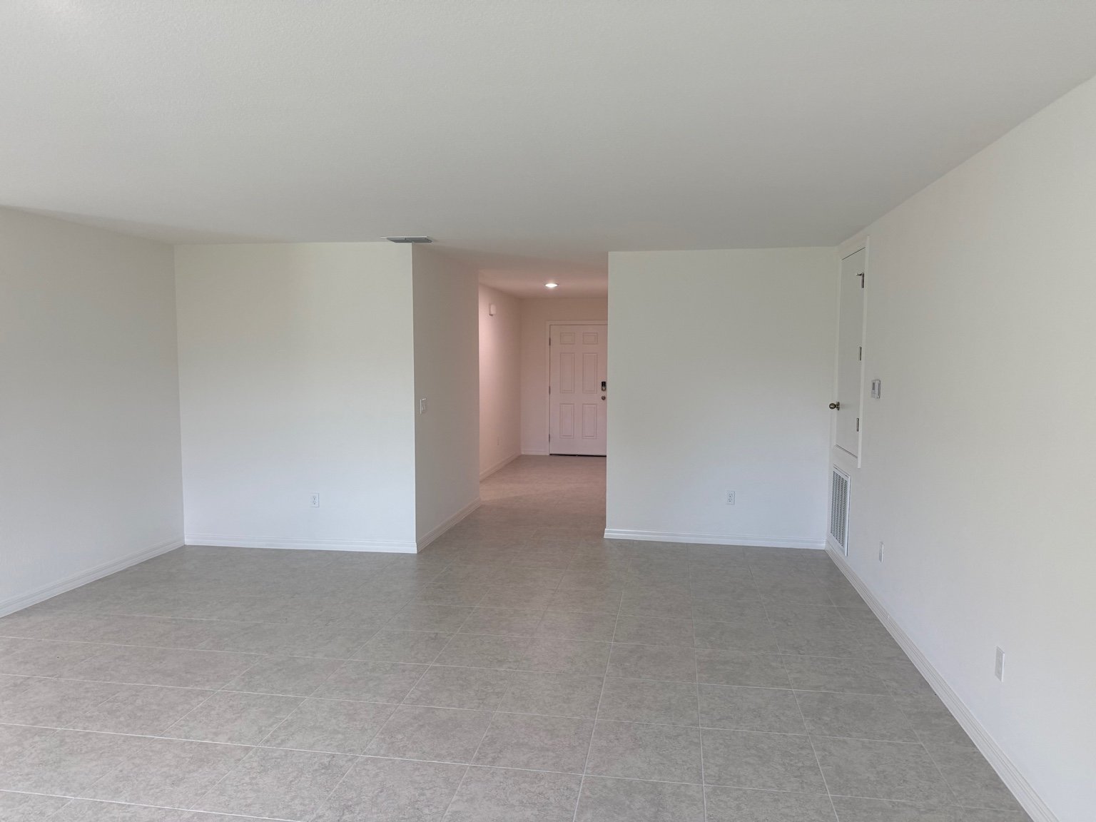 Spacious empty room with tile flooring, white walls, and a large window offering a view of green grass outside.