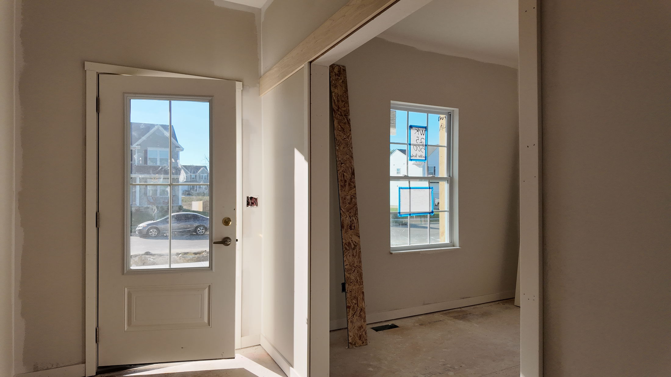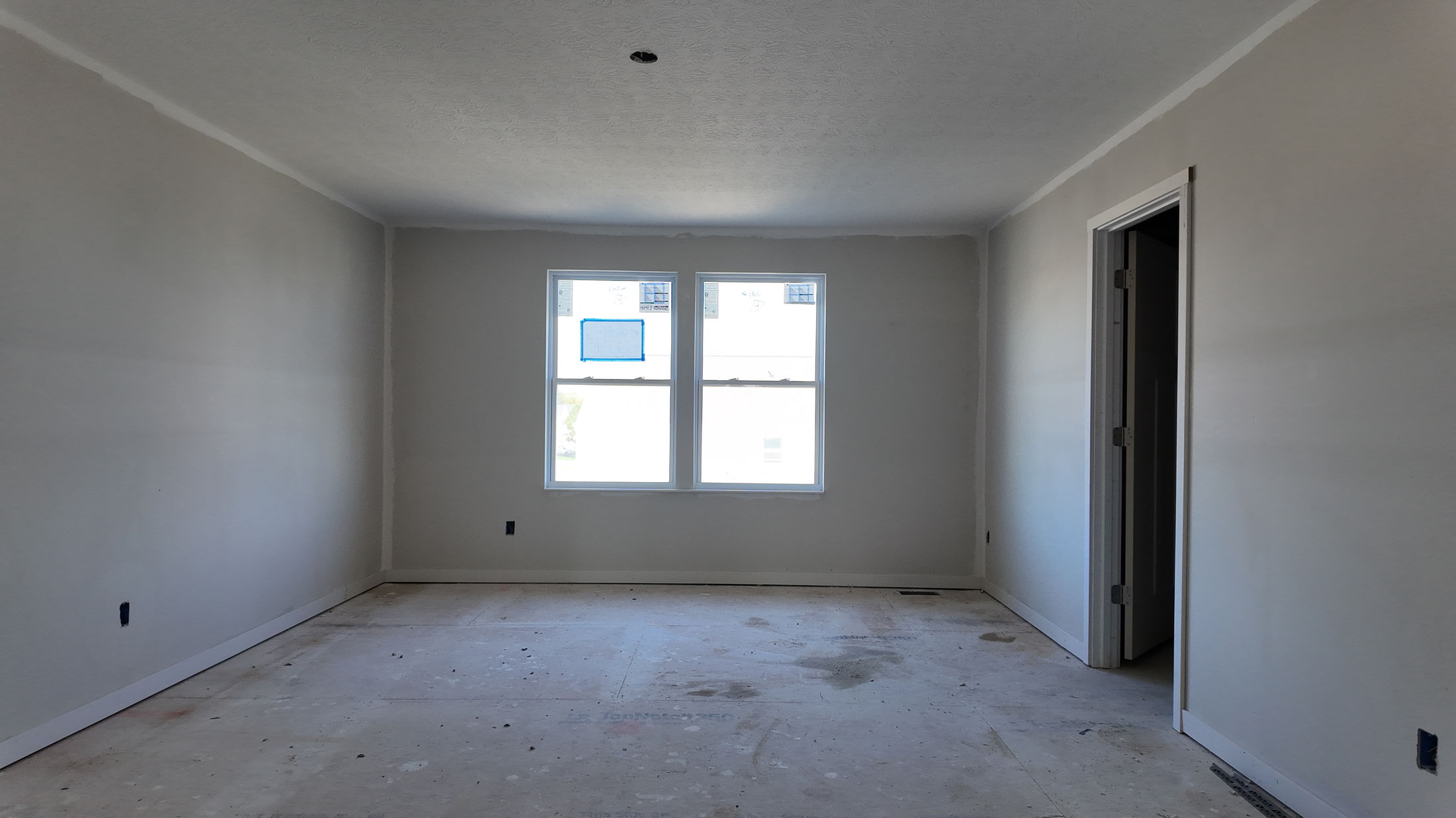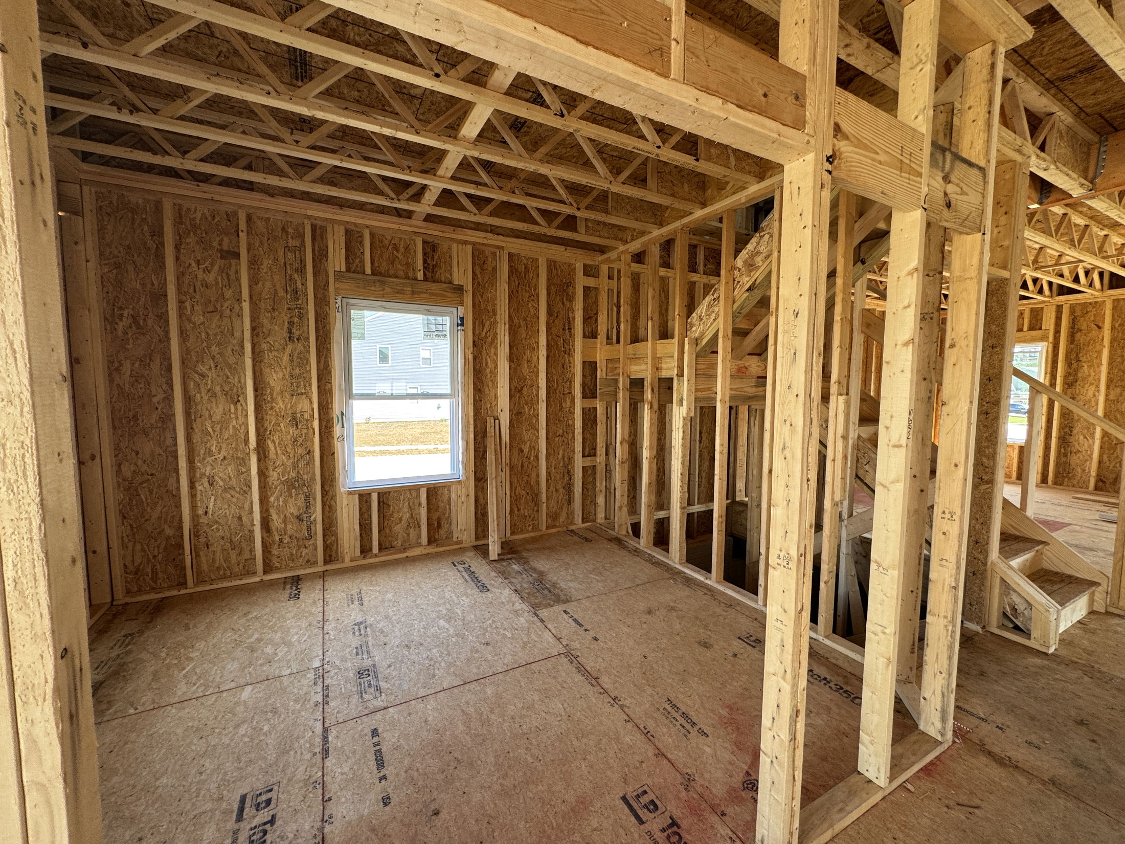 Framed interior of a house under construction, showcasing exposed wooden beams, OSB walls, and two windows.