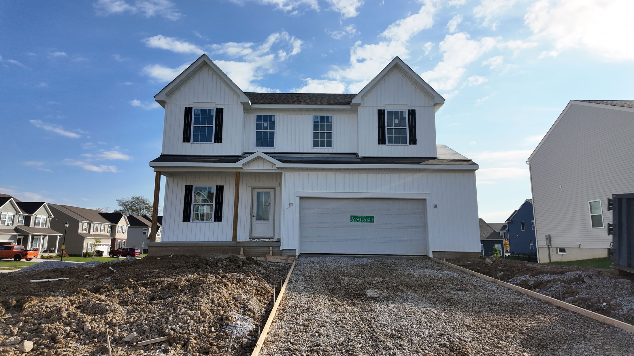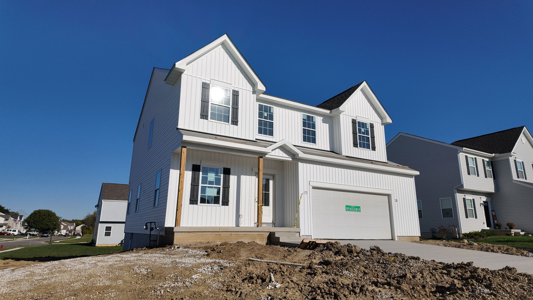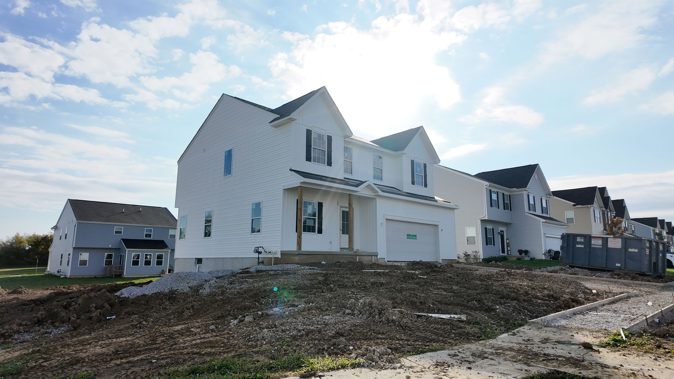 Newly constructed two-story house in a suburban neighborhood under clear blue skies.
