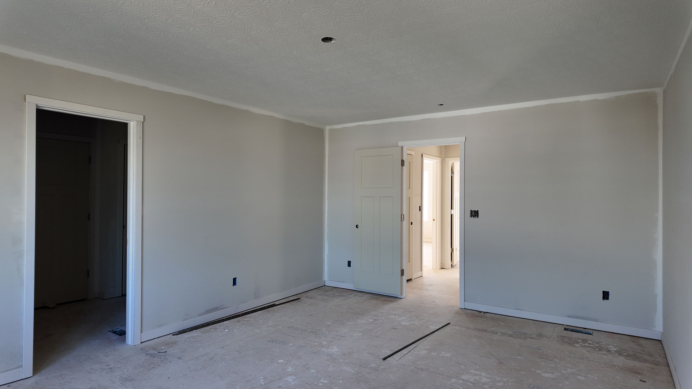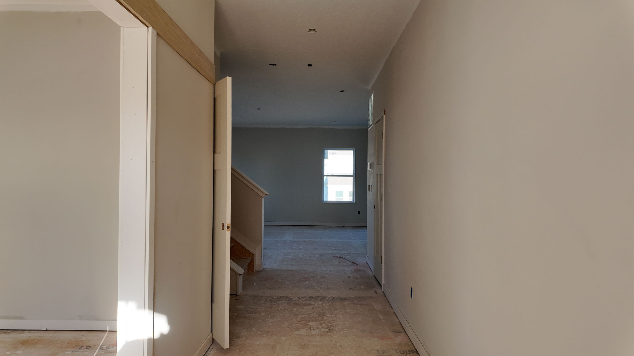 Framed interior of a new construction house showcasing wooden beams and plywood sheathing.