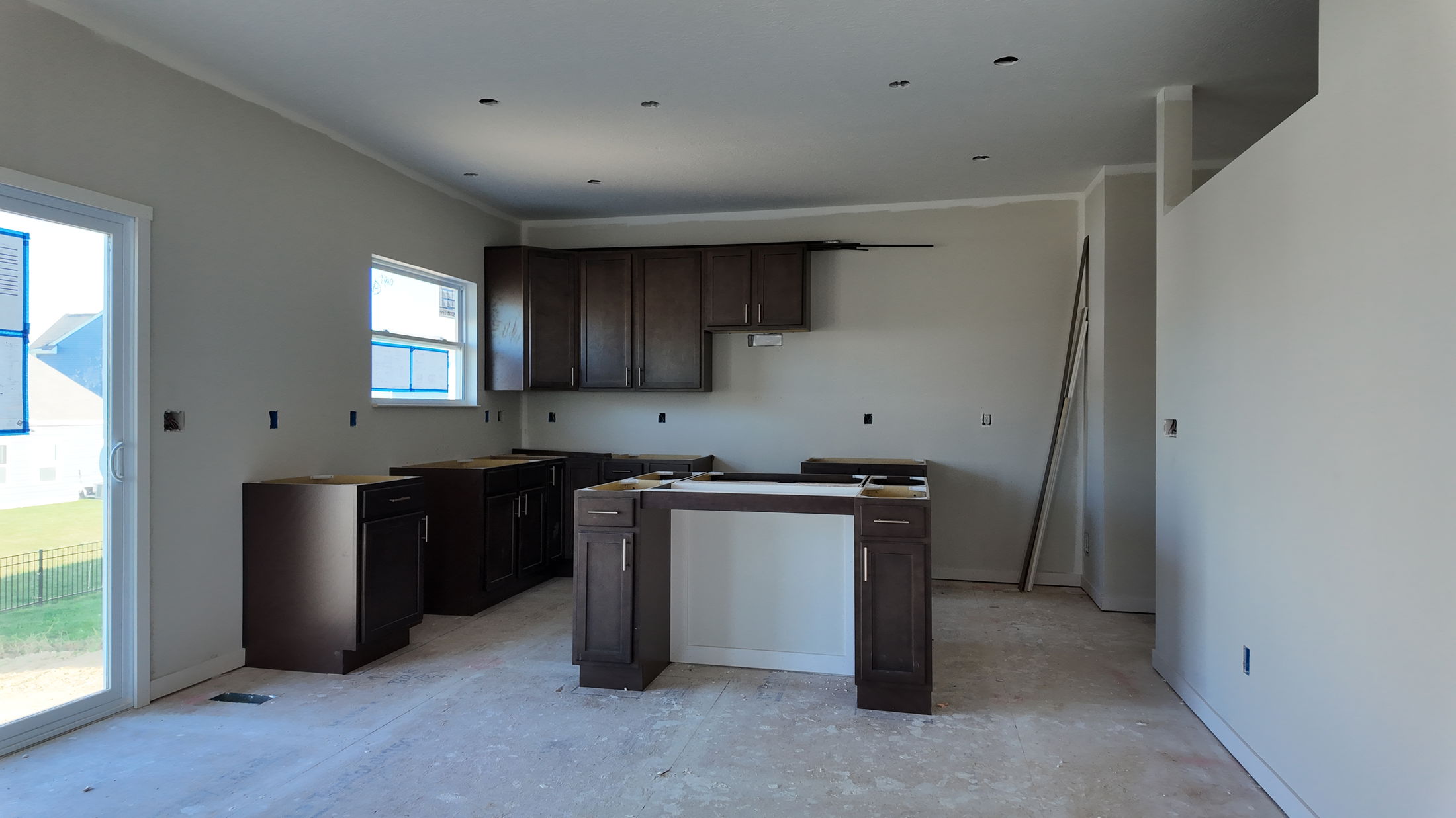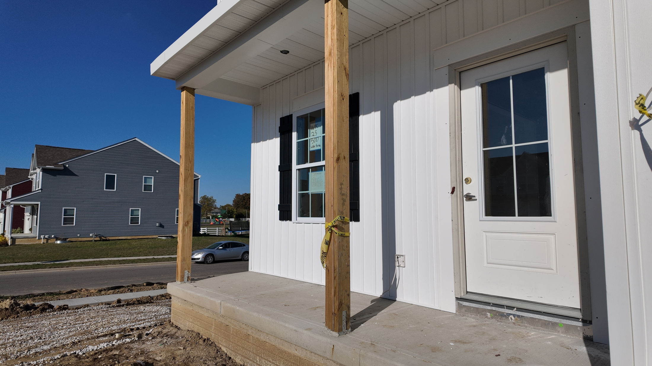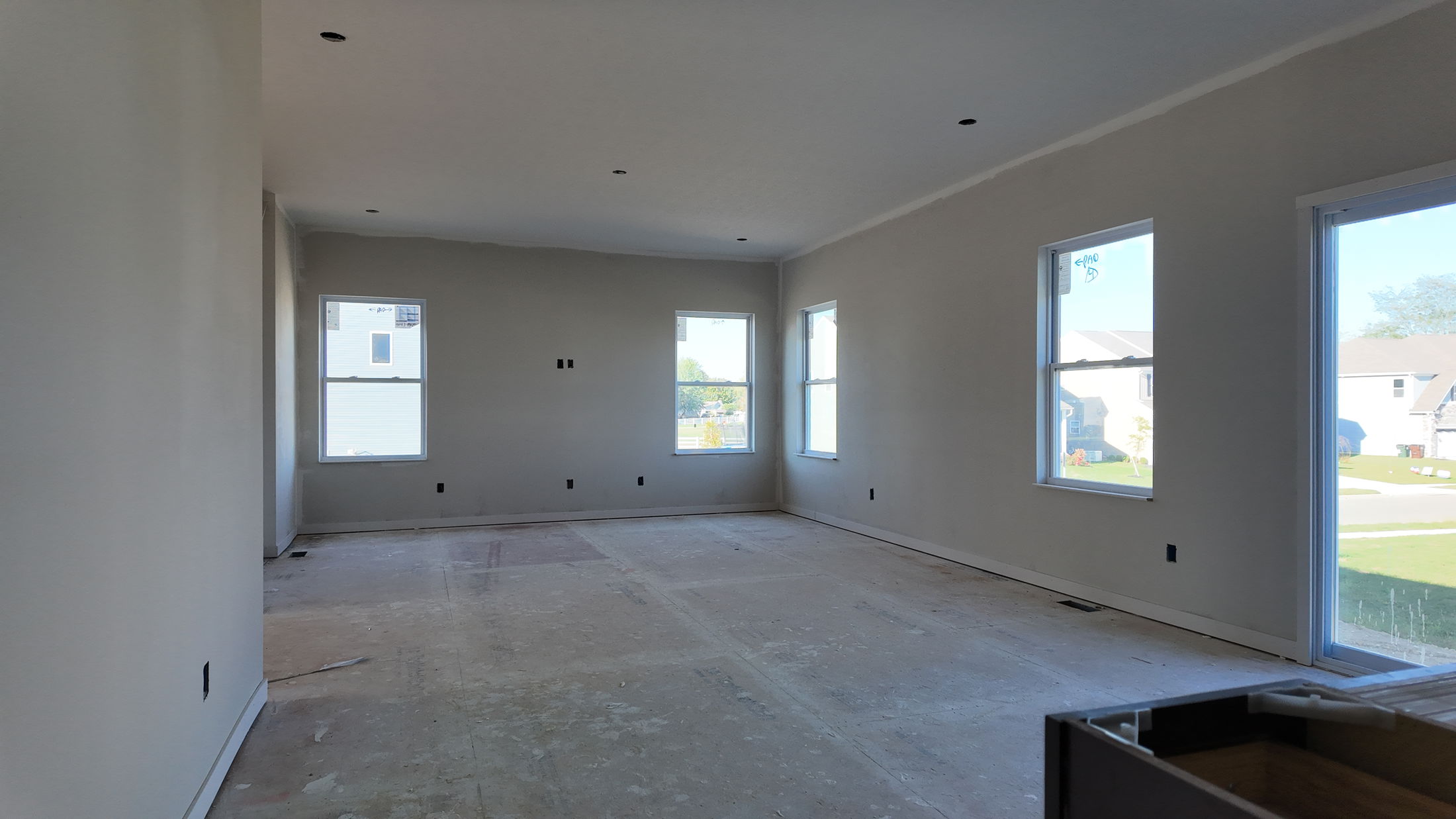 Partially constructed room with wooden framing and exposed trusses, featuring a sliding glass door and outside view of houses.