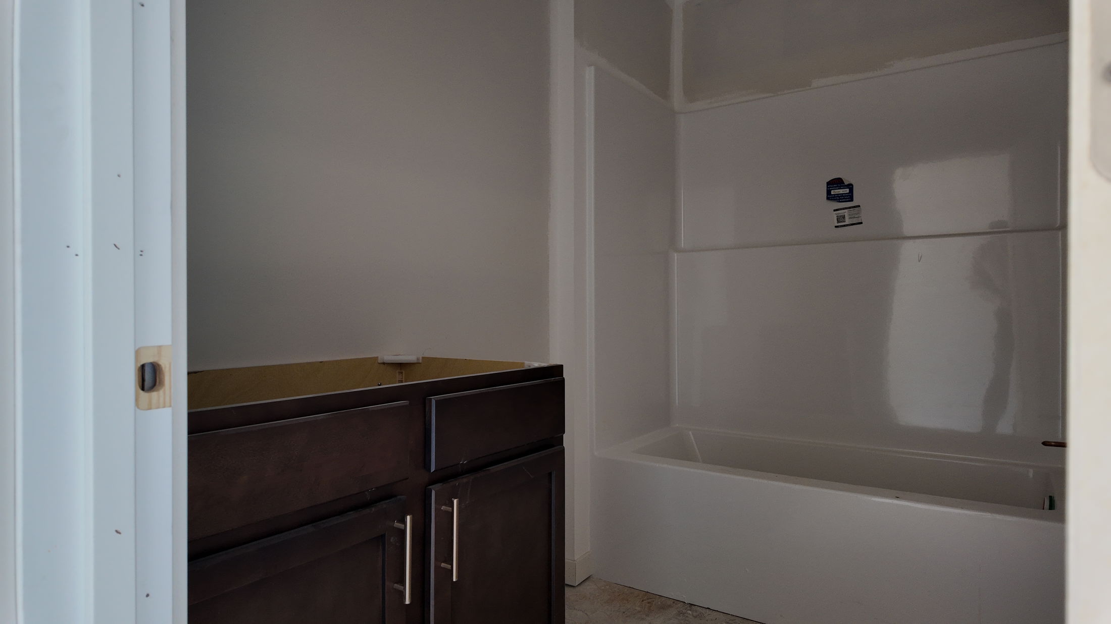 Partially constructed house with exposed wooden framing and an installed bathtub.